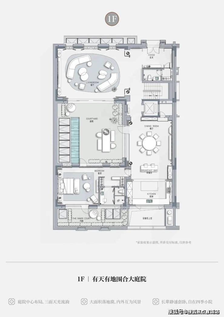 • 庭院中心布局,客厅、餐厅、卧室三面均可采光,内外相映成趣