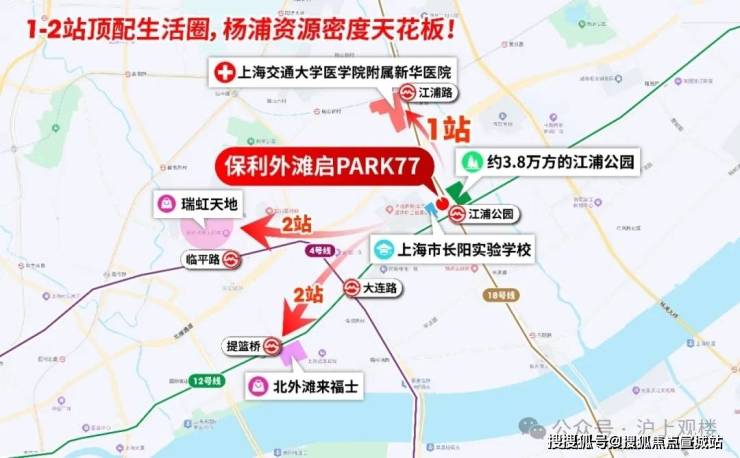 更难得的是, 1-2站范围内,三甲新华医院、北外滩来福士、瑞虹商圈、江浦公园、长阳实验学校等顶配资源一应俱全。