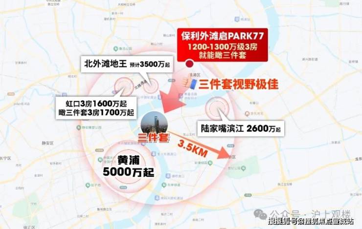 保利外滩启PARK77距离陆家嘴三件套直线距离约3.5公里。以三件套为圆心,环顾这3.5公里范围内的新盘,可以得出几个极具冲击力的结论: