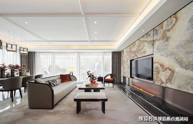 售楼处电话:400/8862/334【热线】客厅和餐厅,以古时「观灯」为主题,餐客一体的设计,空间上宽阔敞亮,视觉上规划有序,总体以米灰色为主基调,配以深色框线。室外的美景作为背景墙,自然与居所协调融合,使家中富有自然气息,有一种树林诗会的意境。水墨玉大理石的天然纹理犹如山水画卷,体现了文人墨客诗意生活不可或缺的部分,即作画赏析的情境,生活也可以充满诗意。