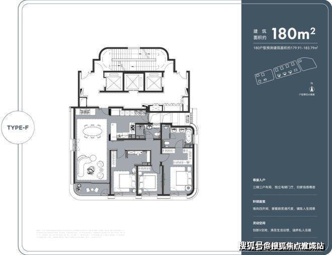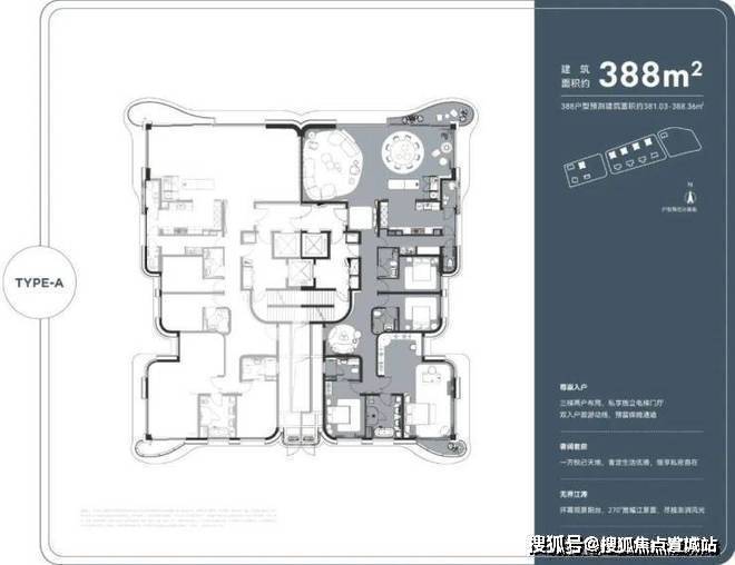 主力户型:建面约 180-380㎡大平层及复式,少量 743㎡顶豪户型。