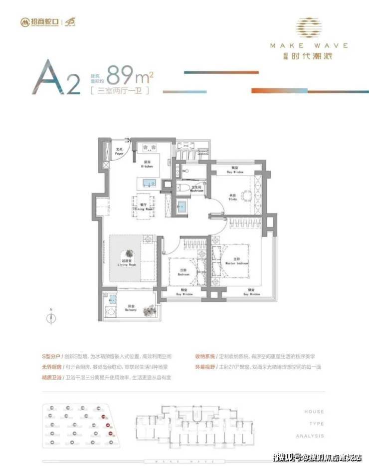 建面约89㎡3房户型:东边套主卧配置约270°双向采光飘窗、S墙设计,主力总价仅约450万级,首付约90万起!☑️☑️招商时代潮派售楼处电话:400-8851-337☑️☑️