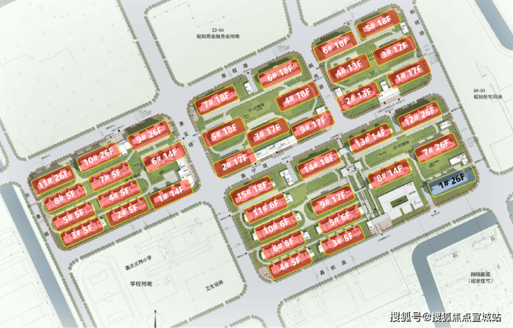 根据公示图显示,该项目的4个小板块最高层为项目东南角和西北角的26层高层,共有6栋,高度接近地块限高的80米(77.80米);18层的共有8栋;17层共有6栋;14层共有4栋;13层共有2栋;6层的共有4栋;5层的共有8栋。