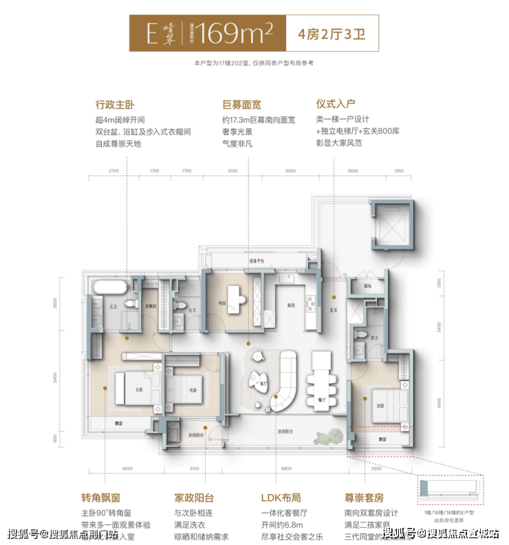 它是一个缩小版的169㎡,同样是四开间朝南、独立电梯厅,总价降至500万级。