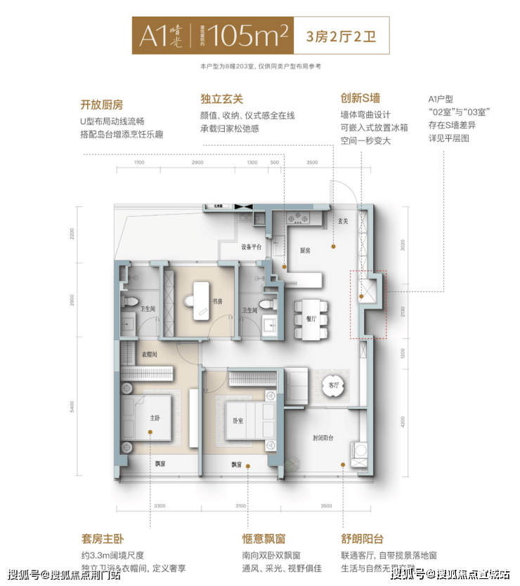 两间南向套房,男女主人和父母都有自己的私人领地,互不打扰。主卧L型转角飘窗,尽可能地室外景观引入;带窗的独立衣帽间,哪个女主人能不爱呢?