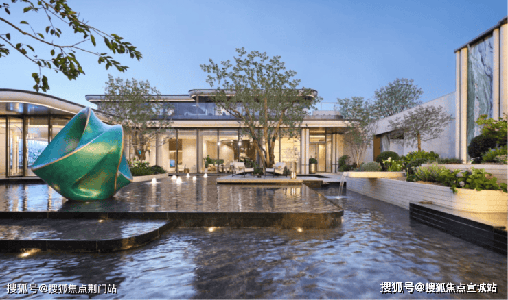 约7米高的主入口,把贝金米黄石材、维多利亚绿等名贵石材,与古铜色金属板、紫薇等名贵草木巧妙搭配、相得益彰,犹如穿着翠绿华服的翩翩公子,透着一身贵气。