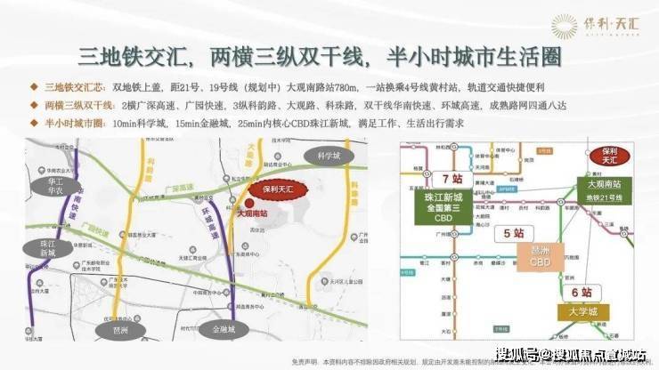 交通方面,保利天汇距离地铁21号线大观南路站约1.2公里,步行大约需要15分钟。建议购置电动自行车进行接驳,一站换乘4号线可直达金融城、琶洲等地,四站到达员村换乘5号线直抵珠江新城。自驾出行同样方便,周边有广深高速、广园快线、大观路等主干道,并且正在建设机场第二高速,确保业主能够快速抵达各区中心。