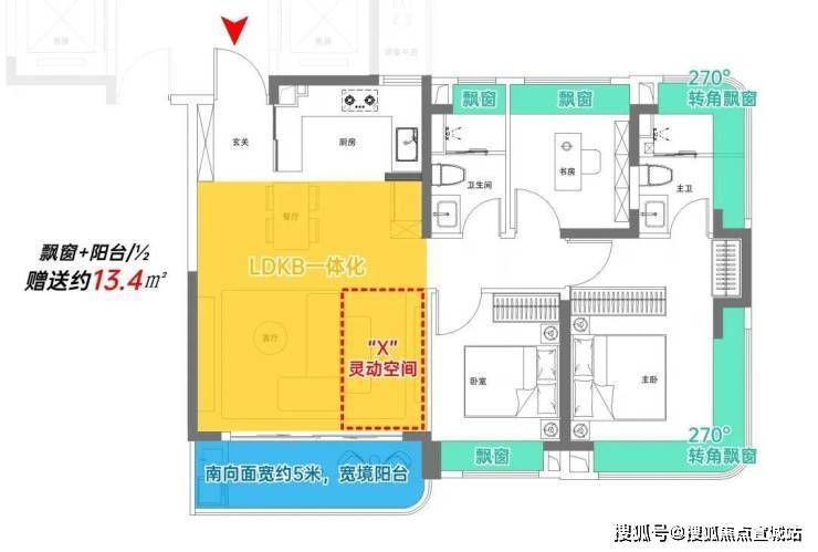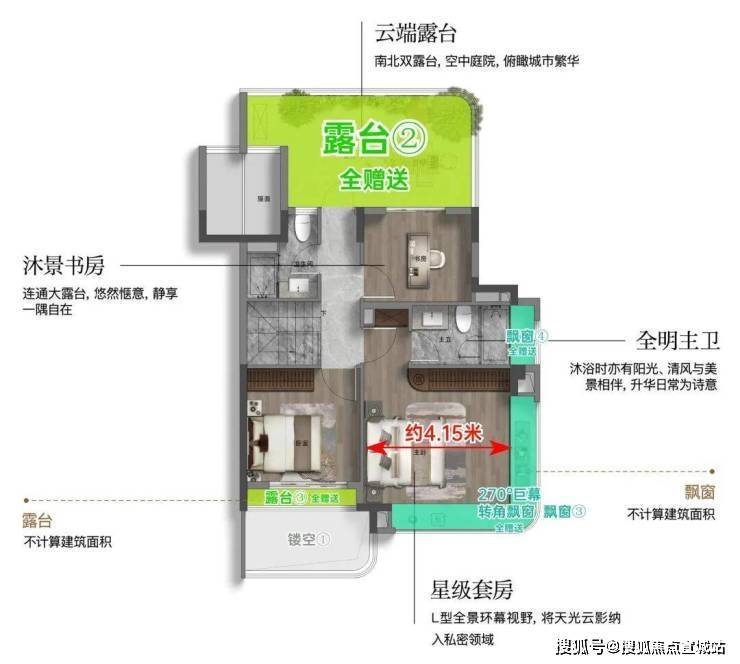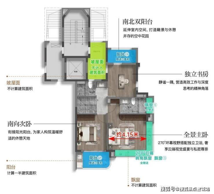 该户型附赠4个飘窗+3露台+1阳合½+挑空+闷顶等,实得率约135%!