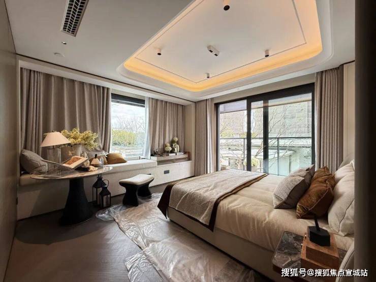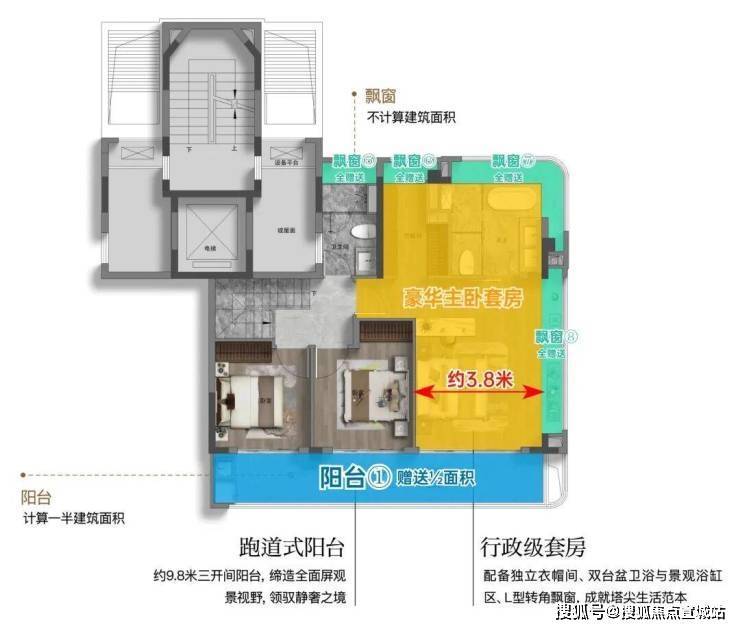 主卧套房南向面宽约3.8米(不含飘窗),边套户型附赠侧边巨幕飘窗,主卫附赠270°弧形转角飘窗;