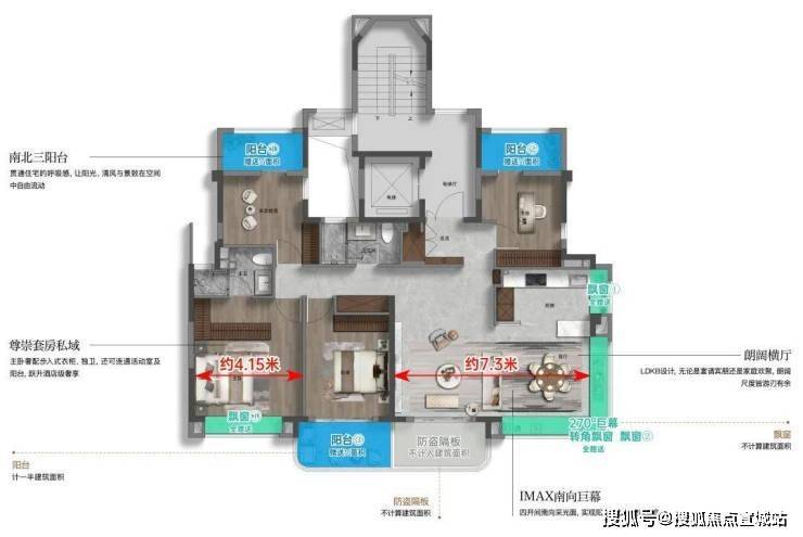 客厅附赠南向露台,同时厨房也附赠飘窗台面(端户),均不计入建筑面积;