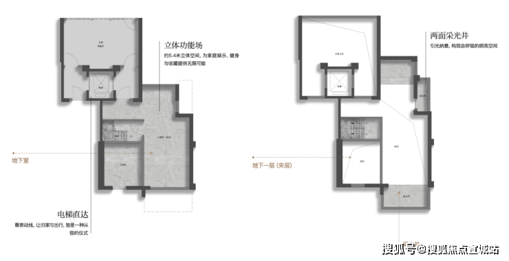 约5.4米地下室挑高,三双面采光井,极致的地下空间感受,可自由定制个性化空间及场景,比如设置家庭娱乐、健身、私人工作室等。