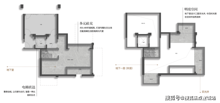 地下室挑高约5.4米,地下夹层层高约2.8米,双面采光井;