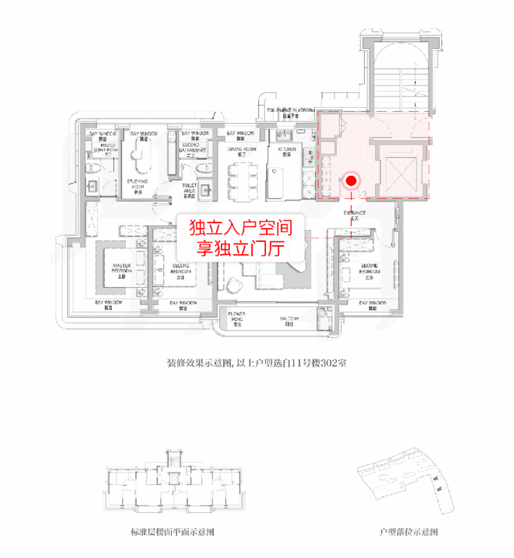 罕见七飘窗设置,主卧还是约270°转角飘窗,可多角度欣赏景观,同时大大增加室内使用面积,据悉七飘窗合计约12平米。