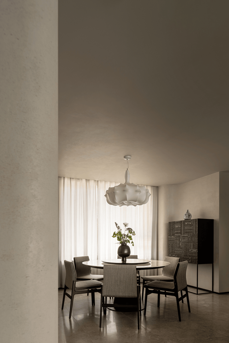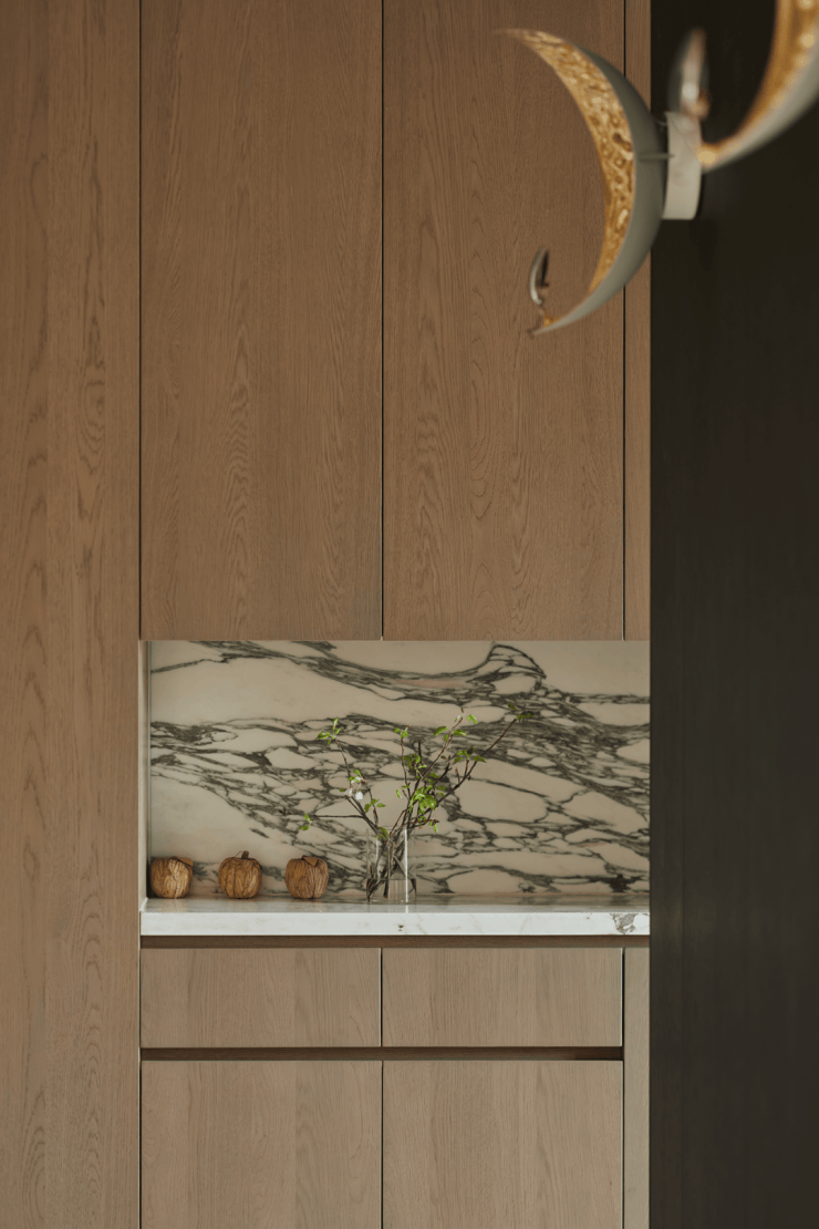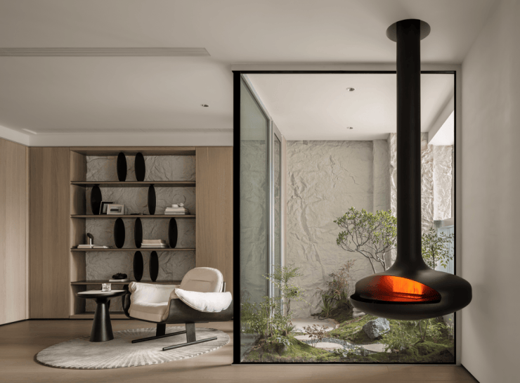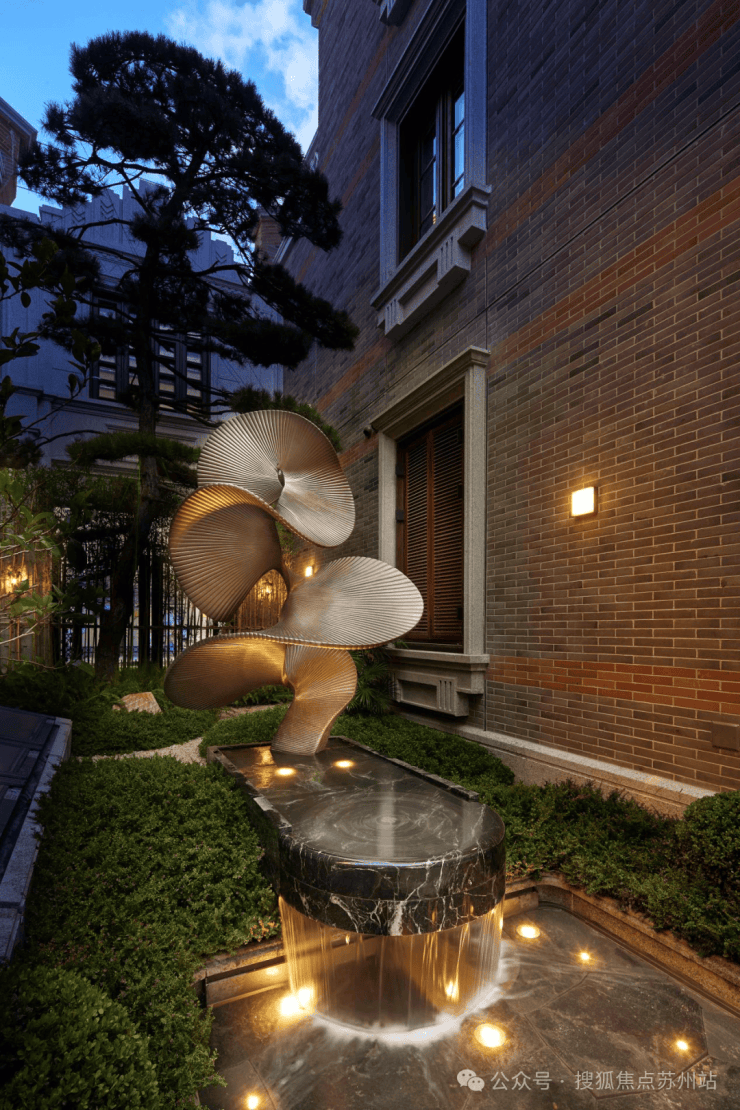 地面延续酒店式落客区海棠纹拼花镶钻,铁打纹工艺,其间还有老石板,青石板,中国黑老石皮,柏坡黄的石皮等原石原面铺装,老石皮从大料里取出,数量少而贵,由此也可看出保利·永兴里在别墅打造上是真舍得,也是真高级。