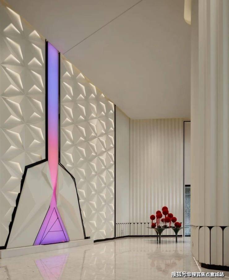 步入挑高约11米的一楼大堂,折线通高墙面与钻石切割前台,像极了兰博基尼发动机的散热鳍,又似来到澳门七星级酒店摩珀斯。