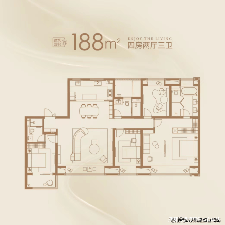 188㎡四室两厅三卫:分布于10#、1#楼,1梯1户尊享配置,南向面宽达18.7米,客厅开间6.2米,主卧面积堪比普通住宅的客厅