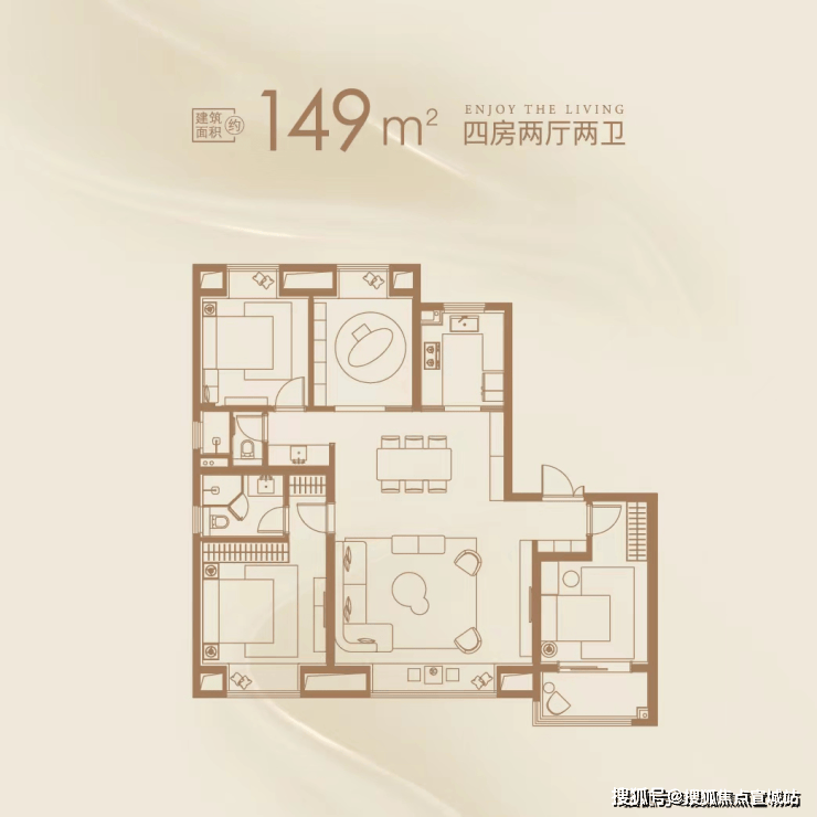 149㎡四室两厅两卫:分布于12#楼,2梯2户设计,总价300-350万。采用LDK一体化设计,南向面宽6.2米,主卧配备L型衣帽间,得房率高达85%