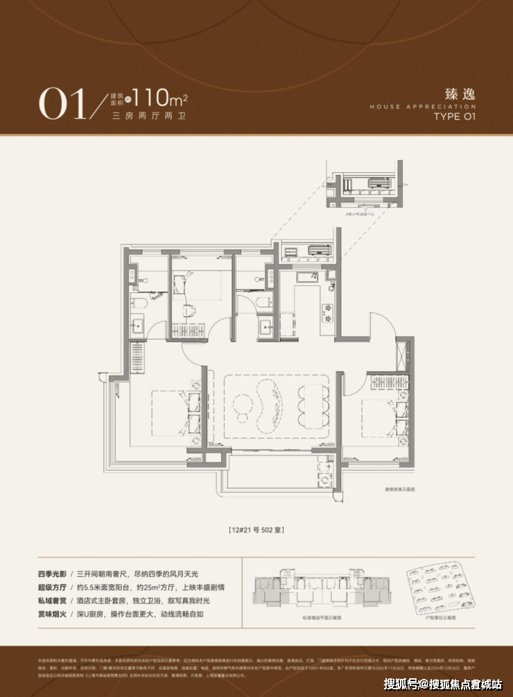 内部配套:配备有超配酒廊、泳池、健身、瑜伽、私宴等功能的星级会所,还设有下沉庭院、架空层、酒店式入口等,公区打造奢华,尽显高端品质。