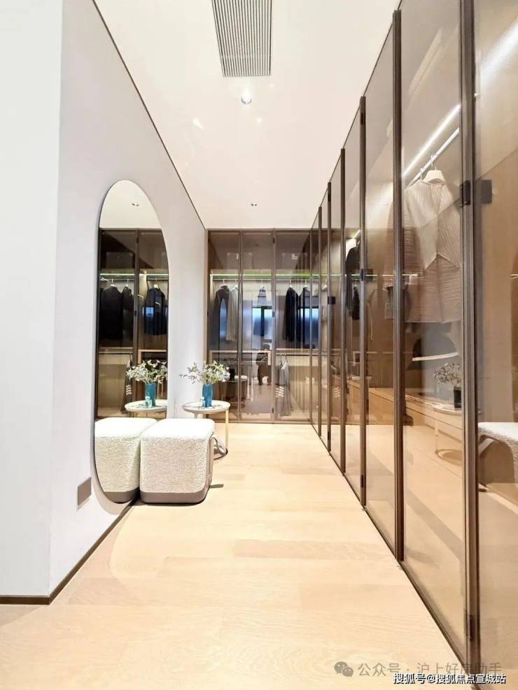 弧形元素缦云上海样板间里随处可见柔和的圆弧修饰,特别是柜体、墙体包边的圆弧转角,在进出各个空间时,减少磕碰的风险,对于有孩子和老人的家庭来说,是非常实用的友好设计。