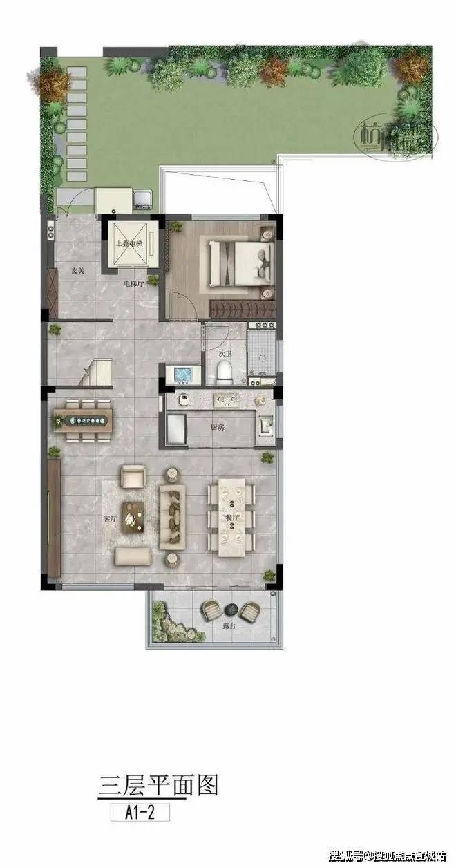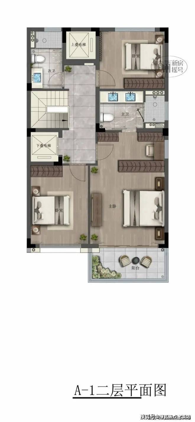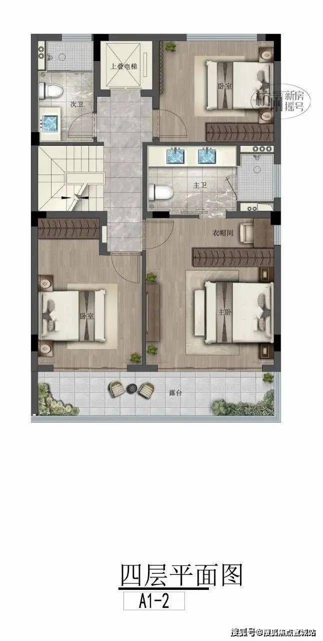 台墅上叠的三层北面可直接入户,与联排产品几乎无差异。电梯入户后既能向上又能向下走,垂直空间生活体系更丰富,向上有约70平的观景露台,向下可直达地下室,更有“墅”的感觉。