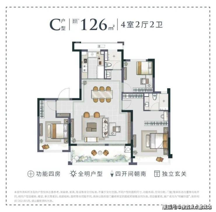 建面约126㎡C户型,四房两厅两卫飞机户型!