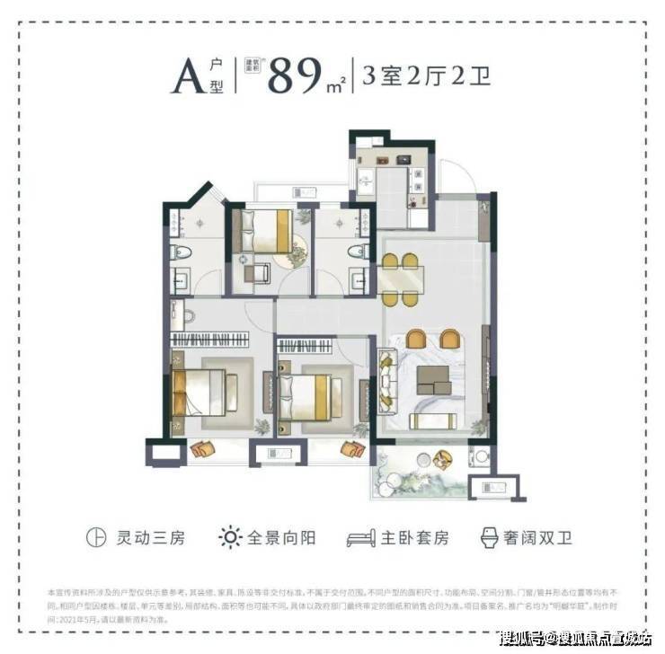 经典且潮流的三开间朝南格局,加上全明的双卫设计,舒适居住细节考量十分优异。