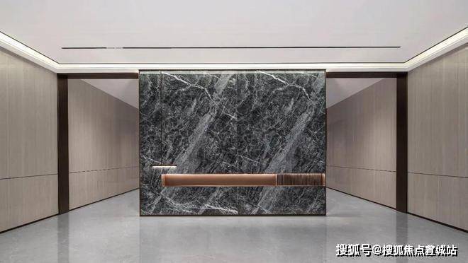 首层入户精装大堂简约大气,墙面采用米灰色大板砖,低调中彰显奢华;地面铺设深灰色仿石材纹地砖,如镜面般的光泽映衬出空间的恢弘气度;顶面石膏板造型顶结合金属线条和灯带……居者在踏入大堂的瞬间,尊崇仪式感油然而生。