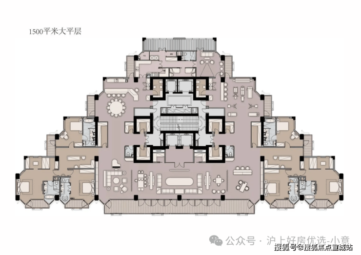 最豪气的还是这个整层一户建面约1500㎡的大平层户型。它南向面宽达60米,有14个阳台!