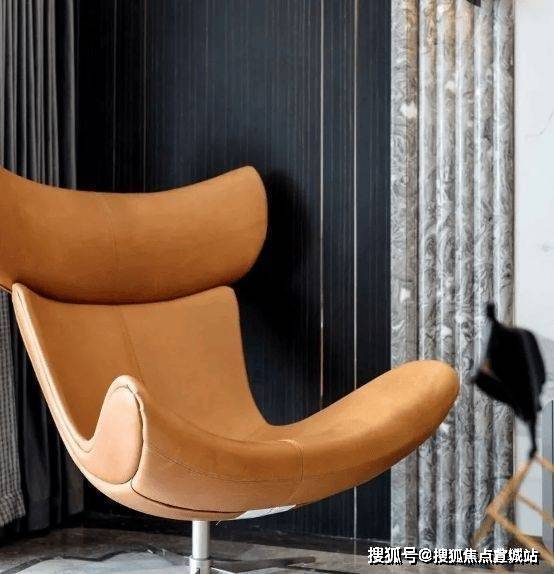 窗户旁边是一把橙色的休闲椅,曲线的造型流畅舒适。棕色木质背景墙,结合线条元素的点缀,体现出空间主人精致的生活态度。