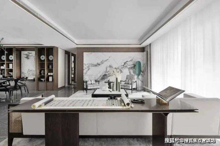 书房空间被设置在了客厅的后方,二者并没有明确的界限和分隔,仅以沙发进行隔断.让空间更显宋式美学的清幽之感.