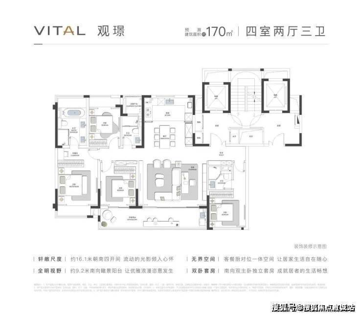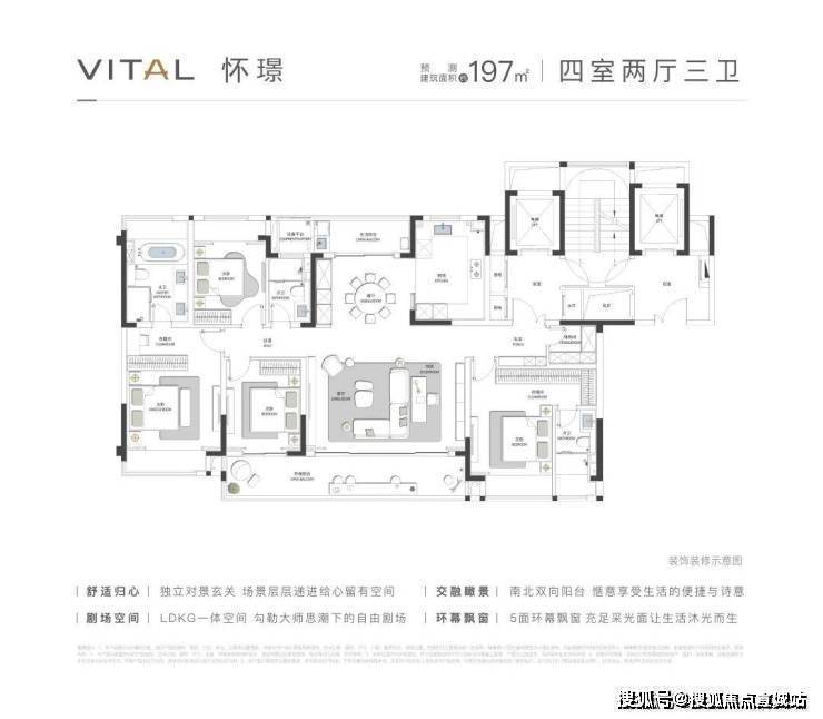 主力户型:有 170㎡、197㎡、230㎡三种户型,均为四室两厅三卫。