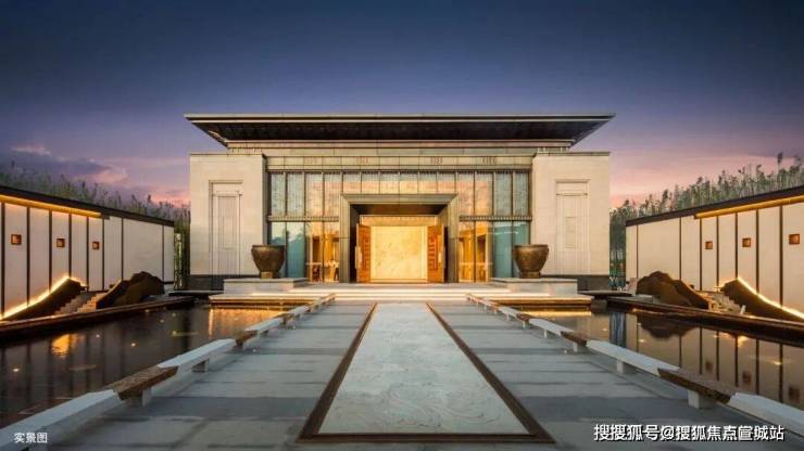建筑风格:以 “宅门、院落、坊巷” 三大体系为根基,复刻北京恭王府规制,打造 “三进仪制空间”。主入口宽 20 米、高 8 米,采用黄色木纹洞石、汉白玉、黄铜等名贵材料,搭配以《千里江山图》为蓝本的影壁墙,彰显磅礴气势。