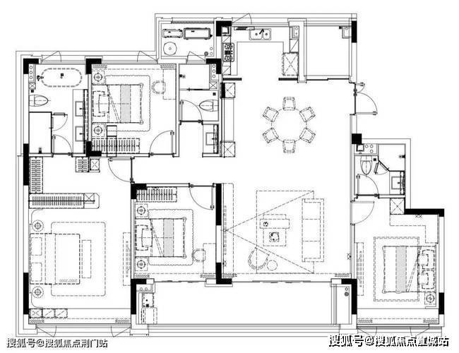 中央的B&BCamaleonda模块组合沙发,以岛状布局重构空间逻辑,双向陈设的低椅背设计。一面朝向书柜电视墙,一面衔接餐厨区。让场景切换随心意而生,既保持空间通透感,又以功能分区提升使用效率。