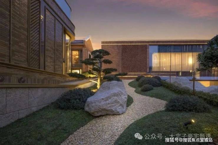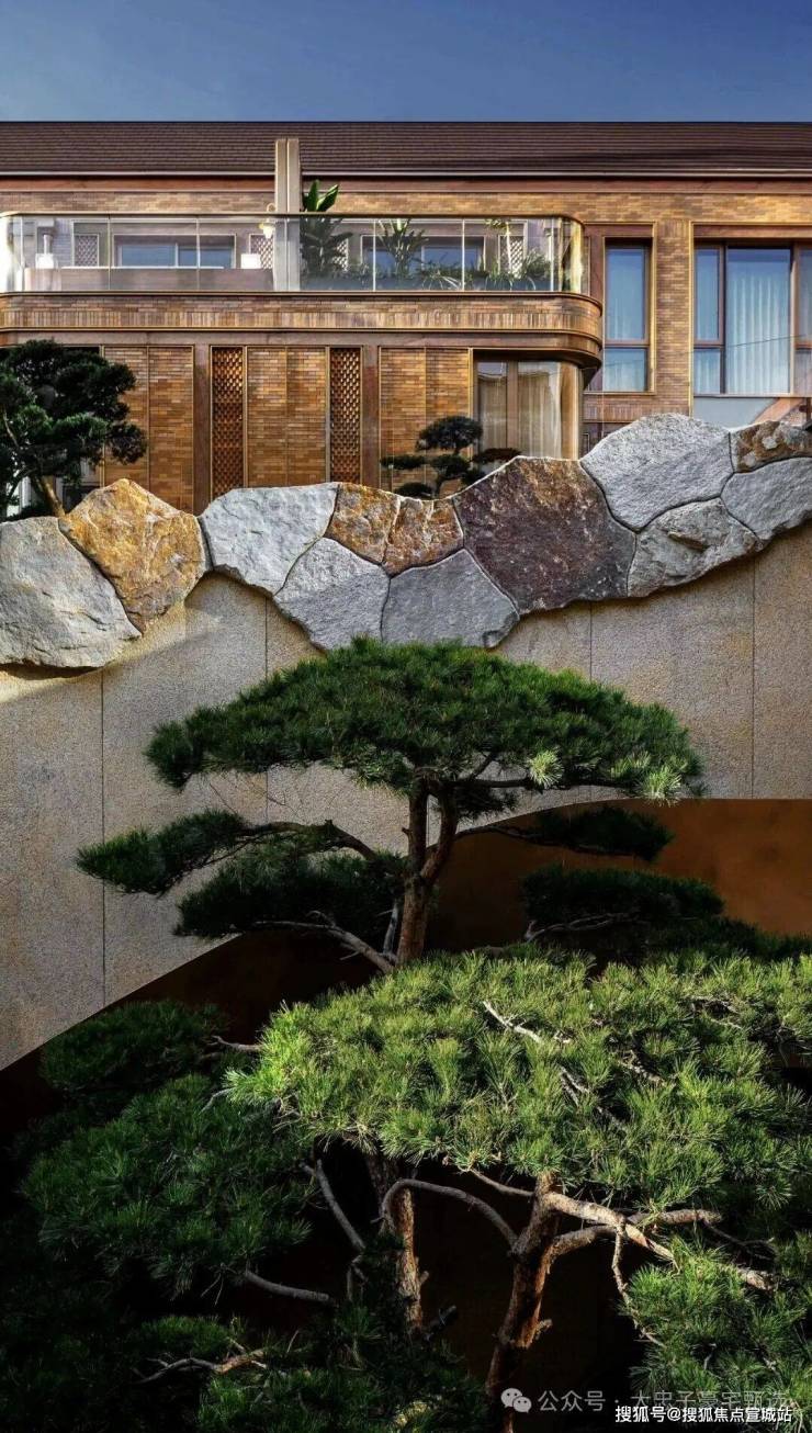 用昂贵的幻彩红奢石,把砖墙的直角做成了更优雅更昂贵的弧线圆角,与红砖形成了更丰富的肌理变化。精心镶嵌的金属线条,勾勒出了建筑的璀璨轮廓。入口处的弧形转角大幅落地玻璃窗,带来高奢酒店的氛围。站在街边,你已经可以看到庭院中的巍巍劲松探出一角,引发你步行归庭的情绪。