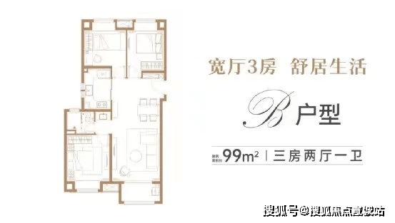 约99㎡3房,客厅面宽非常舒适,三个房间空间都很实用,均能做成正常的卧室。