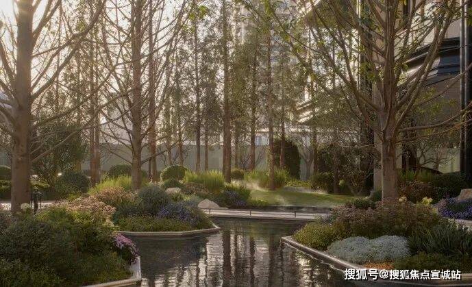 三层归家动线:从地面景观层到架空层,再到入户层,穿越绿植、光影与水景,步步进入私域。