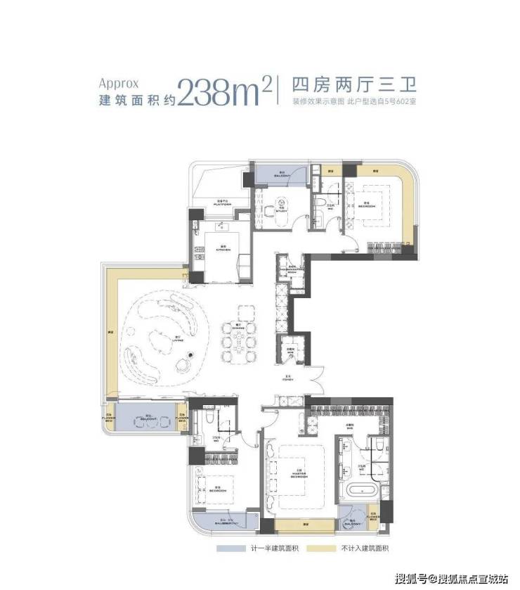 建面约238㎡四房三卫全景舱户型,全屋约46 米全景采光周长,客厅打造连续约 17 米三面采光界面,成就 IMAX 级环幕视野,搭配3.45米奢阔层高,让自然光无死角渗透;朝南双主卧套房搭配全屋六大系统化收纳空间,兼顾家族居住的私密性。