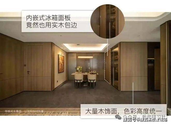 项目墙面铺设大量木饰面,相比墙布,更具质感更温馨。同时为了保持室内色调的统一,建面126㎡内嵌式冰箱的面板也采用木饰面。