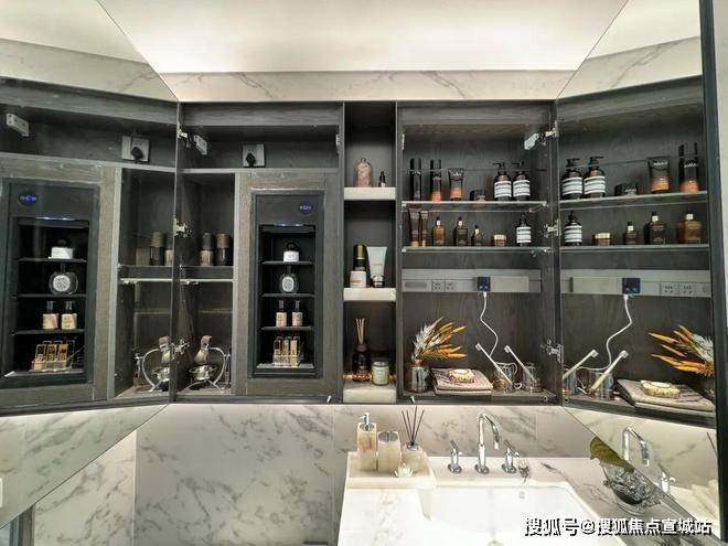 双卫配置,其中一个做了干湿分离,科勒台盆+双智能马桶,除雾镜柜均内置了牙刷消毒器、预留吹风机插座。主卫镜柜还有美妆冰箱,收纳空间相当充足。
