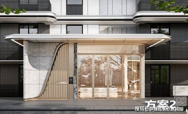 墙面奢华石材+大面积玻璃幕墙结合铜质镶边工艺