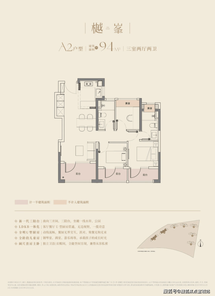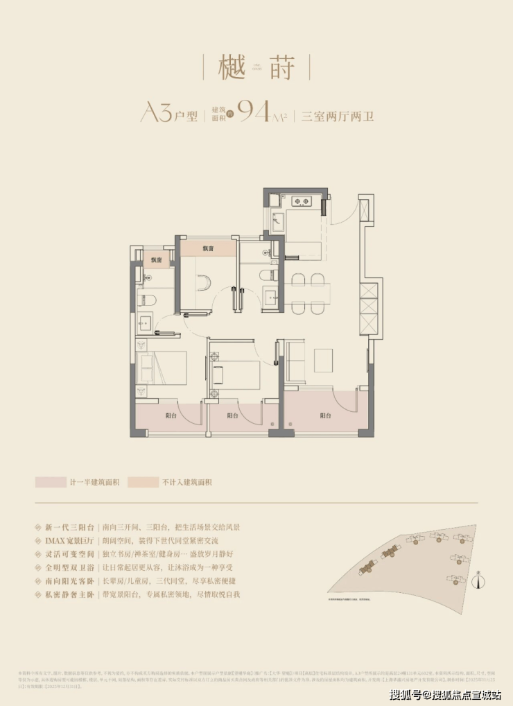 建面约106㎡的三房两厅两卫,3.5开间朝南,南向面宽达到约11.8m!碾压市面上以前的三开间朝南、10米面宽的三房户型。