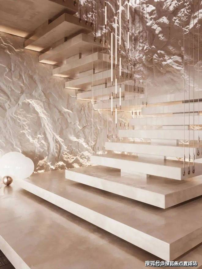 阶梯处更具艺术氛围,里面装饰墙凹凸不平,拾级而上,垂挂的金属吊灯有条不紊,营造了一种浪漫而温馨的氛围感。