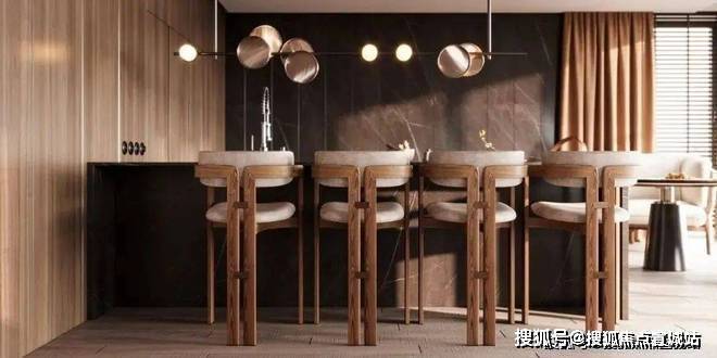 木色的层次充盈了整个空间属性,餐桌的吊灯别具特色,错落有致,与室内的设计格调相呼应,餐凳呈T字形,造型别致的同时又具有实用感。