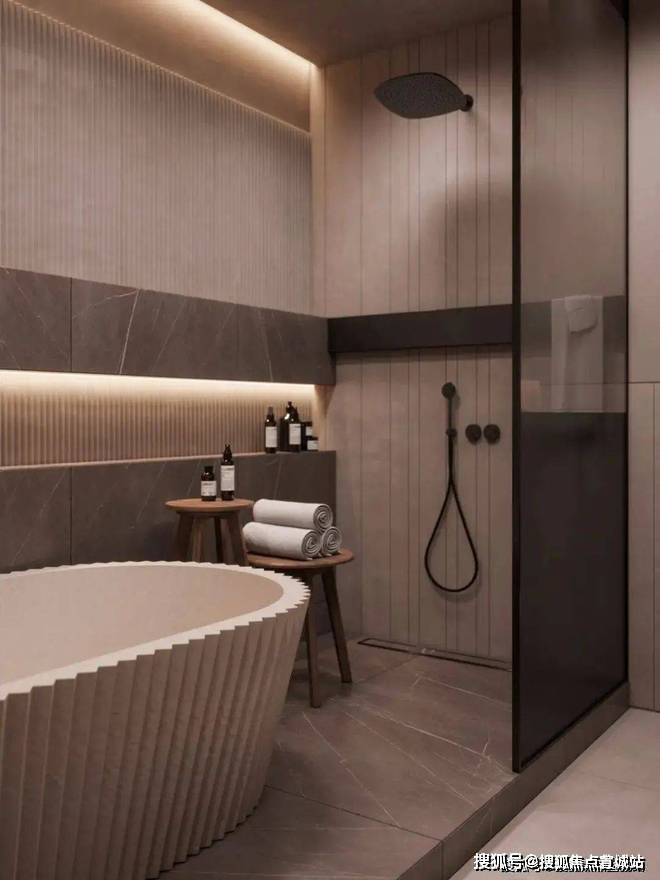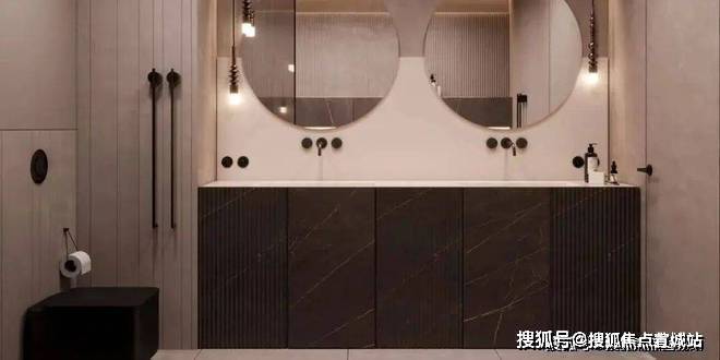 卫生间宽敞而明亮,摈弃过多的射灯或主灯,而是沿用部分照明灯具,立面的装饰线条参差不齐却独有韵味,深色大理石柜体压低了空间的调性,让空间的层次轻重分明。