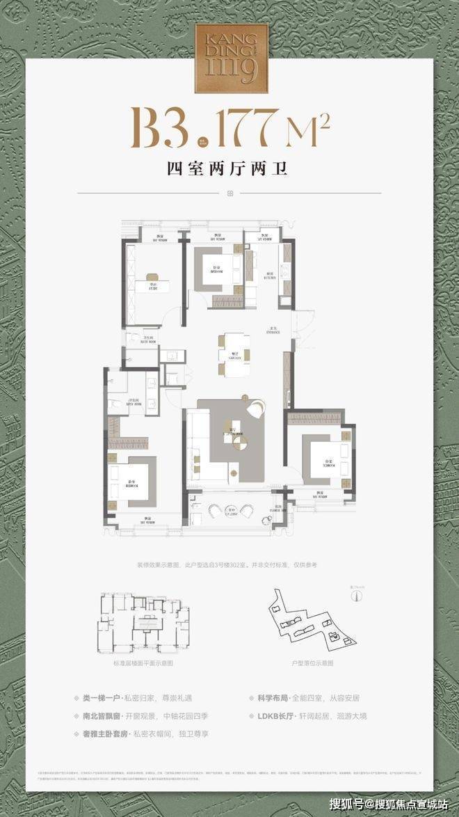 最重要的是,康定壹拾玖这建面约177㎡4房不仅仅是方正,更是飞机户型,三开间朝南+南北通透+无走道的浪费,整个户型相当正气。