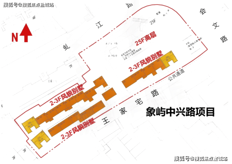 根据规划,项目拟建高层公寓+风貌合院别墅产品。高层为一栋25层高建筑,5-25层为商品房,一层6户,共126套,均为建面约100㎡小三房,该项目综合容积率2.67。