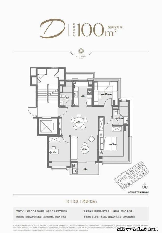 餐客厅采用少见的方厅设计,搭配1.5面宽长阳台,彰显气派,这在百平产品中极难遇到.