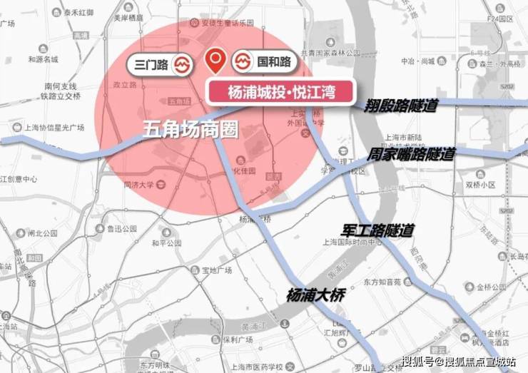 从项目地出发距离约1公里即可到达中环国和路上匝道口,直达市中心。翔殷路隧道,军工路隧道和周家嘴路隧道,是北上海连接浦东浦西的重要通路,也是五角场作为北上海“地区中心”,源源不断吸引来自宝山、嘉定、浦东北部区域人员财源的重要保障。