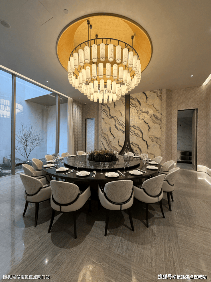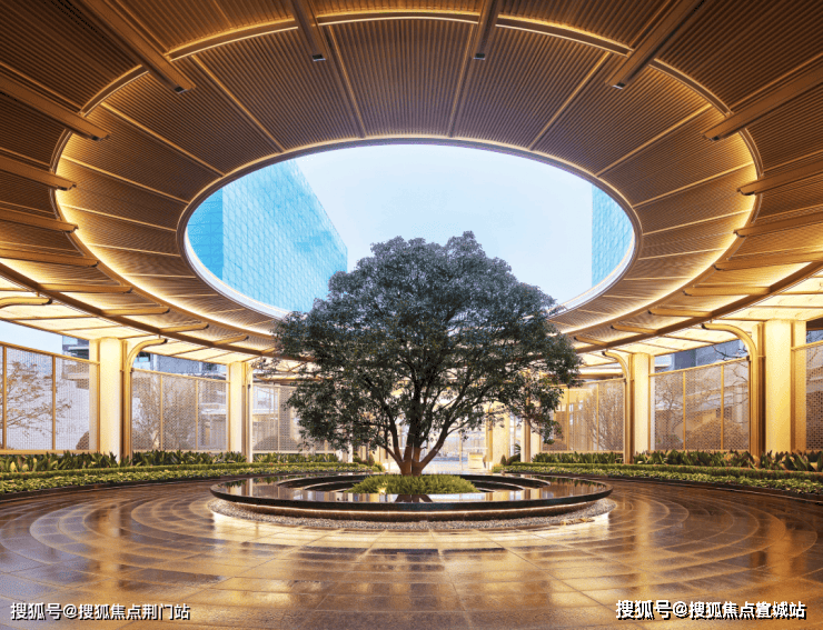 进入大门之后的庭院,用11根约5。3米高的弧形柱子,环绕拉升起了一个巨大的藻井空间,吊顶大手笔用了透光云石,柱顶嵌入了奢石;正中央更是种下了一株百年古桂树,冠幅有约7。6米,树高有约7米,一眼望去仿佛撑满了整片藻井天幕。