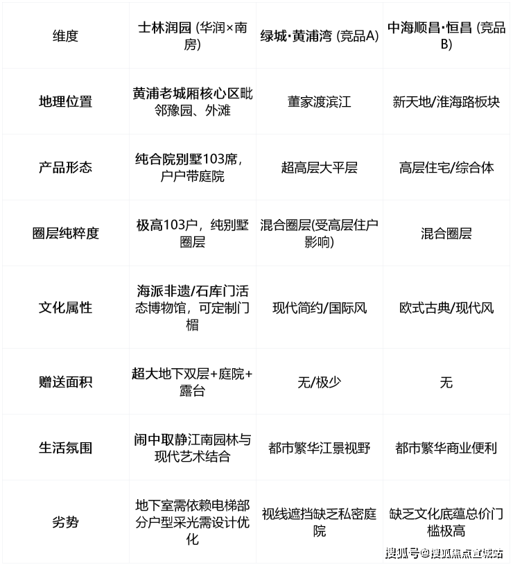 为了客观评价士林润园,我们选取了同区域的绿城·黄浦湾(代表一线滨江大平层)和中海顺昌·恒昌(代表新天地板块豪宅)进行对比。